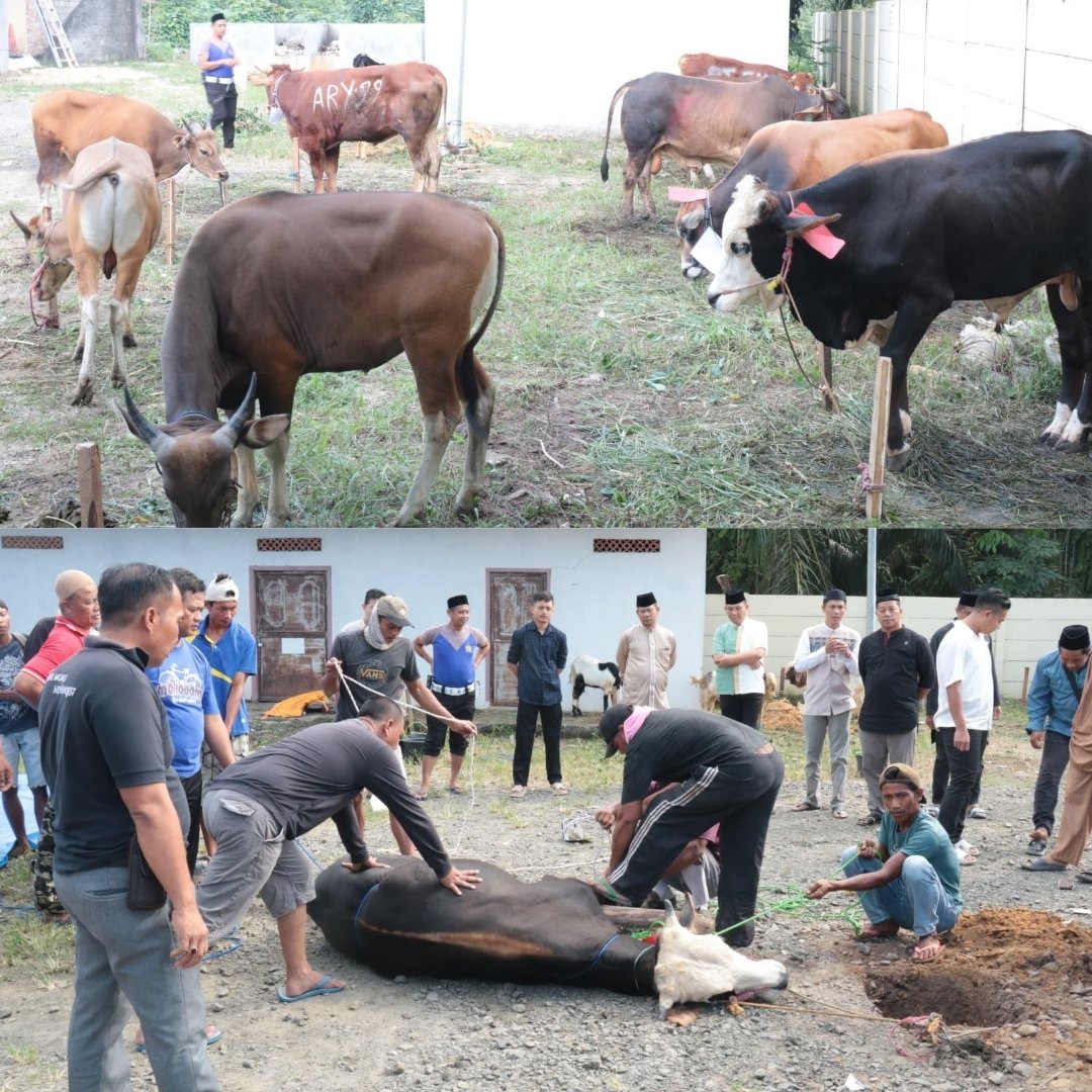 “Pada momen Hari Raya Idul Adha 1446 H / 2025 M atau Hari Raya Kurban, kami dari Polres Tulang Bawang menyembelih 15 (lima belas) ekor hewan kurban, yang terdiri dari 9 (sembilan) ekor sapi dan 6 (enam) ekor kambing”. Ucap Perwira Alumni Akpol 2006.
